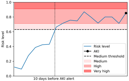 For the model to be usable in a real setting, the model prediction probabilities were mapped to risk levels given by the proportion of AKI successfully predicted within 30 days. This allows the assignment of a risk level to each blood test in real time, assigning the trained classifier’s prediction probability to one of five risk levels; ’Very low’, ‘Low’, ‘Medium’, ’High’ and ’Very high’. The risk levels were allocated by the proportion of predictions resulting in an AKI within 30 days in each interval as described in Table 2, and a breakdown of the proportion of cases in each risk level given in Table 3. An example of these predictions for a patient is shown in Figure 3.