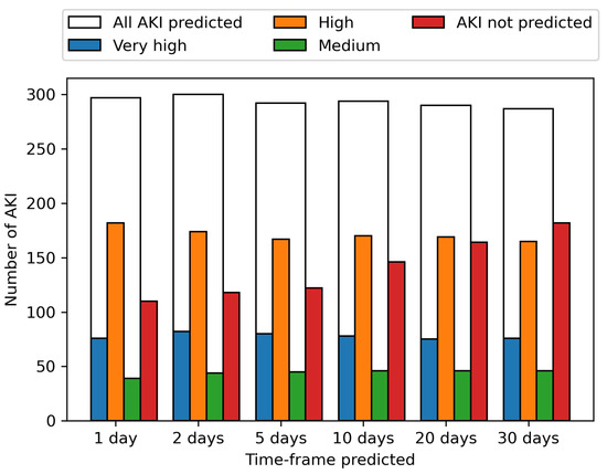 These predictions are shown per AKI incidence across the period from the 1st June to the 31st August for various time-frames in Figure 4. The ability to predict an AKI event increases the closer the prediction to AKI incidence is, with 61.2% of AKI events identified up to 30 days before onset, increasing to 63.7% 20 days before onset, 66.8% 10 days before onset, 70.4% 5 days, 71.8% 2 days and 72.8% the day before onset. The prediction of upcoming AKI at the 30-day time-frame allows a wide window for mitigation methods to potentially prevent the AKI, with the increasing likelihood of correctly predicting an AKI the closer the event is, enabling the model to be used in continuous monitoring.