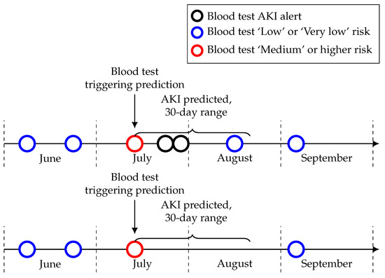 Examples of prediction timelines for patient blood tests. The top image shows an AKI being confirmed after a blood test risk level of ‘Medium’ or higher whilst the bottom one shows an AKI being unable to be confirmed due to a lack of blood tests in the follow up time-frame. Each circle in this figure represents a blood test with the legend denoting a blood test either giving an AKI alert, a ‘Low’ or ‘Very low’ risk level or a ‘Medium’ or higher risk level triggering an AKI prediction.