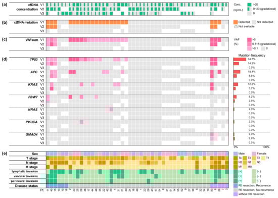 Summary of clinical characteristics and serial cfDNA analysis for 49 colorectal cancer patients. (a) Concentrations of cfDNA is shown gradationally by the width of green bars. (b) Detection of ctDNA mutation at three time points is indicated in orange. (c) VAFsum is shown gradationally in darker shades of pink. (d) VAF of mutations is displayed individually for each gene. Mutation frequencies are also provided on the right side. (e) Clinical and pathological characteristics is summarized by color and shade as indicated on the right; cfDNA, cell-free DNA; ctDNA, circulating tumor DNA; VAF, variant allele frequency; VAFsum, sum of VAFs; V1, pre-operation; V2, post-operation; V3, post-chemotherapy; Conc, concentration; Pt, patient number.