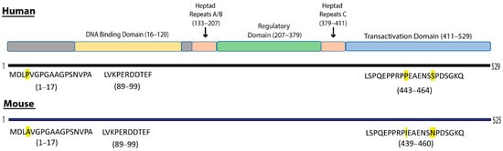 Human HSF1 (HuHSF1) structure contains four main domains: the DNA-binding domain, heptad repeats, the regulatory domain and the transactivation domain []. HuHSF1 contains 529 amino acids (aa) in the sequence and mouse HSF1 (MuHSF1) contains 525aa. Three locations in the human sequence were selected for further testing: aa1–17, aa89–99 and aa443–464. The orthologous sequences in MuHSF1 were also selected (aa1–17 and aa439–460). Highlighted residues represent the change of residue between human and mouse sequences. Human and mouse sequence variants have a 94.1, 100, and 90.1% similarity for aa1–17, aa89–99 and aa443–464, respectively.