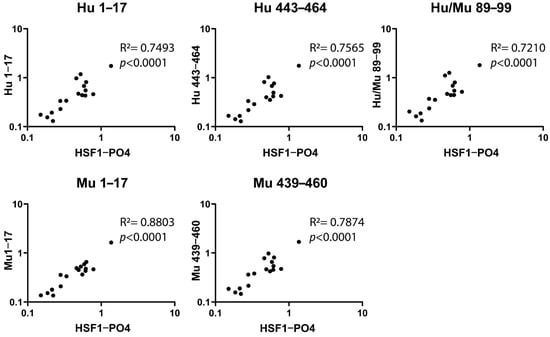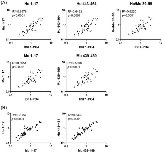 In both cohorts of patients, we observed strong correlations between the responses to mouse-specific epitopes and responses against human HSF1-PO4. As HSF1 is highly conserved between species [], and the orthologous sequences have one or two amino acid differences, we compared the AAb responses in the mouse and human orthologous sequences (Figure 4B). In both sequence locations strong, positive correlations were observed: Hu443 vs. Mu439 (r = 0.9181, R2 = 0.8430, p < 0.0001) and aa1–17 (r = 0.8935, R2 = 0.7984, p < 0.0001) (Figure 4B). These findings indicate the occurrence of cross-reactive antibody responses.