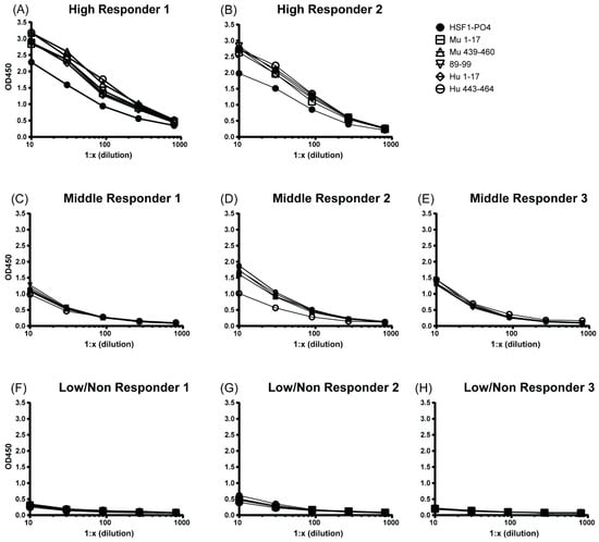 Sensitivity of IgA antibodies to HSF1-PO4 and individual epitopes, at multiple sample dilutions, measured via indirect ELISA. Three-fold serial dilution, of serum, from 1:10 (1:30, 1:90, 1:270 and 1:810), run in duplicate, of individual samples from two high (A,B), three mid (C–E) and three low (G–H) responders to HSF1-PO4. Key is representative of all figures (A–H). All open symbols represent peptides and filled in circle represents HSF1-PO4.