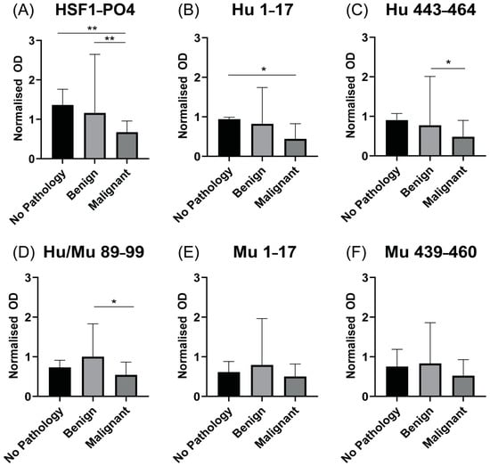 IgA-specific antibodies against (A) HSF1-PO4 and (B–F) predicted epitopes measured via indirect ELISA. Serum samples (diluted 1:10) from Cohort 2 patients (no pathology n = 11, benign n = 9 and malignant n = 23), where malignant samples were collected prior to chemotherapy treatment, were ran in duplicate. All readings were normalised to a mid-range responder consistently run across multiple experiments. OD450nm for mid-range responder: HSF1-PO4 (0.41 or 0.69); Hu 1–17 (0.95); Hu 443–464 (1.0); Hu/Mu 89–99 (0.54 or 0.58); Mu 1–17 (0.52 or 0.62); Mu 439–460 (0.51 or 0.68). As normality tests showed non-normal distributions, data are presented as the median and IQR and Mann–Whitney U statistical analysis was performed, * p < 0.05 and ** p < 0.01.