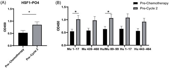 To further evaluate the ability of the peptides to measure the influence chemotherapy has on the IgA-specific antibody response to HSF1, AAb levels towards the peptides were assessed (Figure 7B). There was an increase in antibody responses to all sequences following one cycle of chemotherapy. Of these, Mu1–17 and Hu/Mu89–99 showed significant increases (p = 0.029 and p = 0.048, respectively). This reinforces previous findings of cross-reactive immune responses occurring as well as the potential to use these peptides in place of full-length HSF1-PO4 to measure AAb responses to track changes due to cycles of chemotherapy.