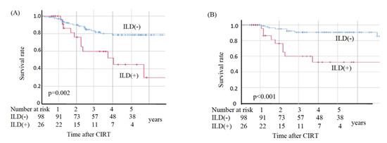 OS was defined as the time between the day of the first CIRT fraction and the day of the last follow-up or death. CSS was measured as the time from the date of initial CIRT until the date of death from the primary lung cancer or the last follow-up. Any death after disease progression was defined as death from the primary lung cancer. LC was measured from the date of initial CIRT to the date of the first local progression in the irradiated area or the date of the last follow-up. The OS, CSS, and LC rates were calculated using the Kaplan–Meier method. Differences in the OS, CSS, and LC rates between non-ILD and ILD groups were compared using the log-rank test. Differences in the numerical variables between the two groups were examined using Fisher’s exact test and the chi-square test. A p-value < 0.05 was considered statistically significant. All statistical analyses were performed using SPSS (version 26; SPSS Inc., Chicago, IL, USA).