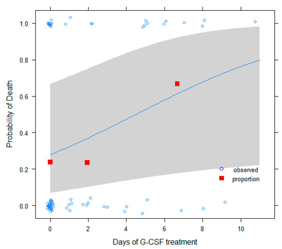 Death probability as a function of G-CSF treatment days: observed data (open circles, fitted to ease visualization), proportions (red squares, in subgroups of <1, 1–4, and >4 days), and fitted logistic model with 95% confidence bands are shown.