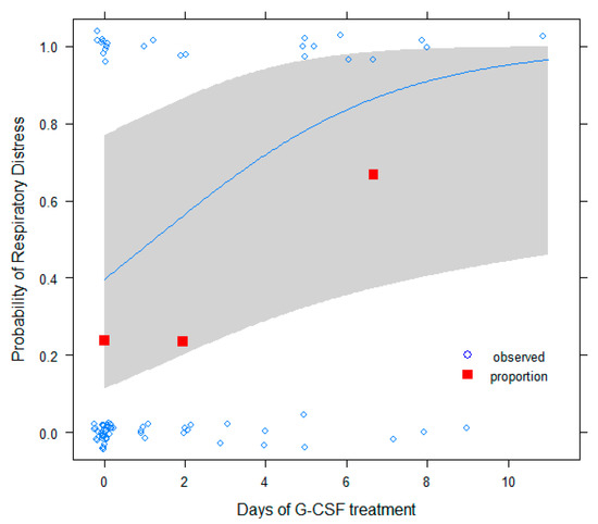 Respiratory distress as a function of G-CSF treatment days: observed data (open circles, fitted to ease visualization), proportions (red squares, in subgroups of <1, 1–4, and >4 days), and fitted logistic model with 95% confidence bands are shown.