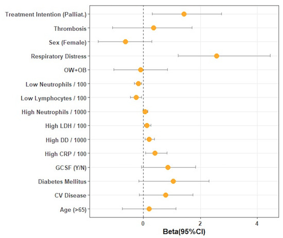 Figure 1 shows a forest plot with the odds ratios (and corresponding 95% confidence intervals) for the association of different factors with mortality in our sample. In it, we could not find a significant association between age, ECOG, cardiovascular disease, type of tumor, or stage and mortality. Diabetes was related to a worse outcome and a higher risk of mortality compared with non-diabetes, although not significant (30.4% vs. 11.3%; p = 0.0533). The intention of treatment (palliative vs. curative) was also related to a trend of higher mortality in those patients with palliative treatment: 19 (83%) versus 4 (18%) patients, but this relation did not reach a statistically significant value (p = 0.064). Regarding oncological treatment, all patients treated with a combination of chemotherapy and immunotherapy died (3, 100%), but we could not find a significant association to a worse prognosis of SARS-CoV-2 infection and type of anti-cancer treatment received. Focusing on infections with COVID-19, in this series, we found that those patients with any type of pneumonia and neutropenia (unilateral, bilateral, unilobed, or multilobed) presented higher mortality compared with those without it: 19 (82.6%) versus 4 (17.3%), p = 0.0027. We also observed that men had more severe pneumonias compared with women, with higher oxygen requirements: 67.5% multilobe or bilateral in men versus 44.3% in women, p = 0.011. Although we did not find a significant relation between the type of tumor and COVID-19 mortality, we observed that 72.9% of lung cancer patients presented more severe infection with COVID-19, followed by colon cancer (41.2%), although this association was not significant (p = 0.064). We found an association between body mass index (BMI) and oxygen requirements when classified as no oxygen requirements vs. any oxygen flow. Oxygen support was needed in 57.2% of patients with BMI < 20, in 68% with BMI 20–25, in 82.6% with BMI 25–30, and in 100% with BMI > 30 (p = 0.0045). Smoking status was also associated with a higher risk for severe pneumonia and worse COVID-19 prognosis: 33 (73.3%) of smokers or former smokers developed some type of pneumonia vs. non-smokers, 12 (26.6%), p = 0.0035. In this series, 23 (27%) of all patients included died due to infections with COVID-19, and respiratory failure was present in all of them (100%). In our series, as we expected, higher oxygen needs were related to a significantly higher risk of mortality. We observed that low counts of neutrophils (p = 0.001) and lymphocytes (p = 0.013) were related to a higher mortality, and high values for LDH (p = 0.001) and Protein C (p = 0.003) were also associated with a worse outcome. In our cohort, corticoid administration in our patients with SARS-CoV2 infection and neutropenia was associated with a trend toward a lower mortality rate (52.17%) compared with patients without (67.9%) (p = 0.08). Regarding the impact of G-SCF administration, we observed a significant relation to mortality with 60.9% versus 39% in patients who did not receive G-CSF, as described before. There are also different conditions related to G-CSF administration, related as well to worse outcome, such as oxygen (p = 0.003) and carbapenems (p = 0.15) requirements (p = 0.003), pneumonia (p = 0.0585), and neutropenia severity (p = 0.035). Patients treated with G-CSF received corticoids more frequently compared with those without G-CSF (50% versus 16%).