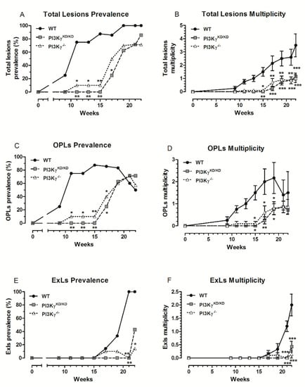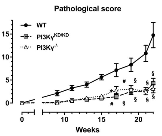 3.3. Lesion Severity Is Decreased in PI3KγKD/KD and PI3Kγ−/− Mice if Compared with WT Mice