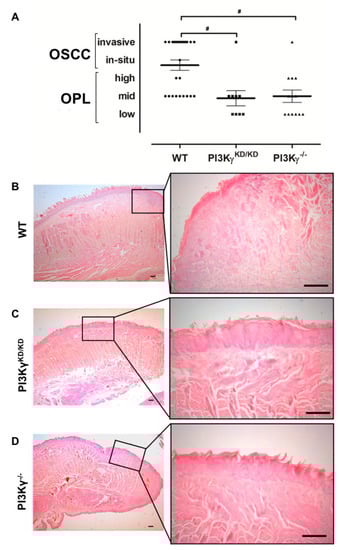 3.2. Oral 4NQO-Carcinogenesis Is Delayed in PI3KγKD/KD and PI3Kγ−/− Mice