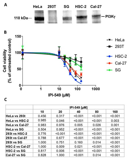3.6. PI3Kγ Expression in Neoplastic and Epithelioid Oral Cell Lines and the Effect of Its Inhibition on Cell Vitality