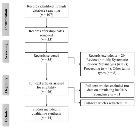 As a result, a total of 14 studies were identified (Figure 2) to describe the transcript abundance of 13 circulating lncRNAs in OS patients with respect to healthy controls [67,68,69,70,71,72,73,74,75,76,77,78,79,80]. Information pertaining to the methods employed for lncRNA extraction, measurement, and normalization along with their diagnostic and prognostic values were extracted and are listed in Table 1.