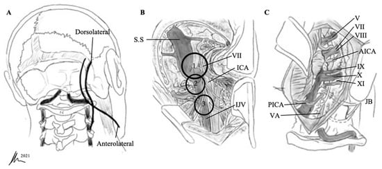 - Katsuta, T.; Rhoton, A.L., Jr.; Matsushima, T. The jugular foramen: Microsurgical anatomy and operative approaches. Neurosurgery 1997, 41, 149–201, discussion 201–142. [Google Scholar] [CrossRef]