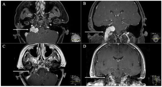 A 56-year-old female patient presented with headache, cerebellar dysfunctions, hearing loss, hoarseness, and extinguished gag reflex. (A) Preoperative axial and (B) coronal T1-weighted gadolinium-enhanced MRI, showing an impressive JFS (arrows) with a quasi-dumbbell shape and both intra- and extracranial components through the JF (Samii Type D). (C) Postoperative axial and (D) coronal MRI control, indicating complete resection (arrows) through a dorsolateral ELITE approach. Postoperatively, no new deficits occurred, and the patient recovered from the cerebellar dysfunctions, hoarseness, and extinguished gag reflex.