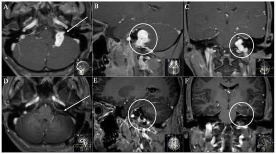 A 26-year-old male patient presented with progressive hoarseness, dysphagia, and extinguished gag reflex. (A) Preoperative axial (arrow), (B) sagittal (circle), and (C) coronal (circle) T1-weighted gadolinium-enhanced MRI, showing the JFS with intracranial extension (Samii Type B). (D) Postoperative axial, (E) sagittal, and (F) coronal MRI control, indicating complete resection through a dorsolateral ELITE approach. Postoperatively, no new deficits occurred. He suffered from postoperative temporary vertigo; hoarseness showed slight improvement during follow-up.