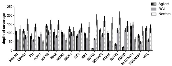 However, analyzing the depth of coverage of PPGL-associated genes, significant differences were observed between genes and platforms. The most under covered regions belonged to SDHA, SDHC and SDHD genes in Agilent library preparation (Figure 1, Supplementary Table S3).