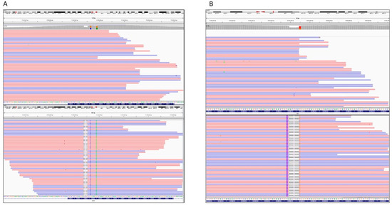 In summary, of 61 prospectively tested cases 19 (31.1%) harbored pathogenic/likely pathogenic variants (all variants detected in our cohort are summarized in Table 3). Of these variants, eight could be considered as novel as they have not been reported in any database to the best of our knowledge (Table 4). All these variants were confirmed by Sanger sequencing. Five of these is classified as pathogenic or likely pathogenic (all of these variants are truncating variants). Three variants are classified as VUS. Two SDHB variants: SDHB(NM_003000.3):c.263C>T (p.Thr88Ile); SDHB(NM_003000.3):c.268C>G (p.Arg90Gly) occurred in a patient where another pathogenic or likely pathogenic variant was identified (Figure 2, Panel A). The distribution of sequencing reads containing these variants show that these variants occurred at the same chromosome, therefore they are all in cis. The third VUS was detected in a patient with NF1 syndrome (Case 24). This is a complex alteration which has been annotated differently by various tools. However, looking at the sequence, this variant would is named NF1(NM_001042492.2):c.5047_5053delinsGGAG(p.Asn1683_Ser1684_Trp1685delinsGlyGly) (Figure 2, Panel B).