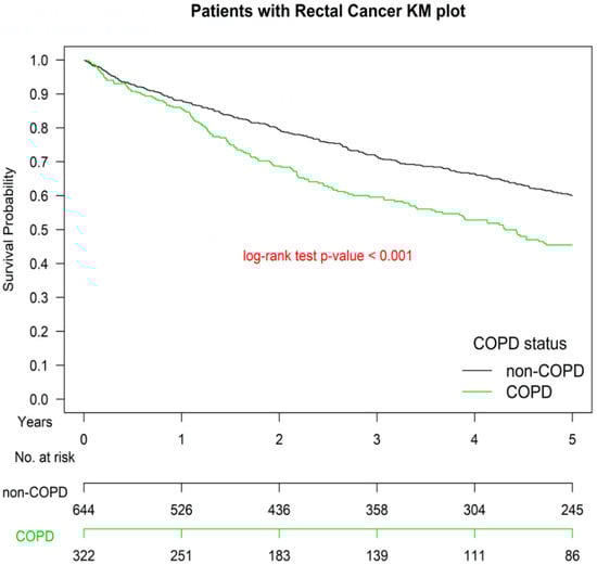 In Table 1, potential comorbidities or cancer risk factors related with survival in COPD or rectal adenocarcinoma were considered as the covariates through head-to-head PSM and showed a balanced distribution in Groups 1 and 2. COPD has been linked to a number of comorbid conditions [], such as diabetes, hyperlipidemia, hypertension, CKD, and cardiovascular diseases [,,,]. Proactive identification and treatment of comorbidities can improve outcomes []. Thus, we also considered the aforementioned comorbidities as covariates through the PSM design to balance distribution between the two groups (Table 1). Due to the head-to-head PSM design, all covariates were balanced, and all-cause mortality was significantly higher in Group 1 than in Group 2.