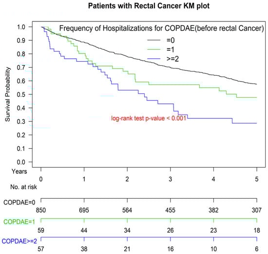 Multivariate Cox regression analysis indicated that COPD and ≥1 or ≥2 hospitalizations for COPDAE within 1 year before the index date were poor prognostic factors of OS (Table 2). Our study is the first study to estimate the survival impact of COPD (Figure 1) and its severity (measured as number of hospitalizations) before the diagnosis of rectal adenocarcinoma in patients with rectal adenocarcinoma (Figure 2). The reason for this association may be that COPD, especially severe COPD, can increase the risk of more intolerable cardiotoxicity or treatment-related toxicity, decrease the cancer-treatment completion rate, or cause more major complications after treatment [,,,,]. Another possible explanation is that smoking may cause more aggressive rectal adenocarcinoma [], and active and heavy smoking is more common among COPDAE phenotypes []. Therefore, smoking-related COPD and COPDAE might be alternative preoperative markers of survival in patients undergoing curative resection for rectal adenocarcinoma. Furthermore, a higher number of hospitalizations for COPDAE within 1 year before the index date was associated with worse survival (Table 2 and Figure 2). Future clinical trials should verify whether these novel prognostic factors of OS for rectal adenocarcinoma identified in the current study affect survival rates. Moreover, in a future study, we aim to evaluate the duration of smoking cessation that may be effective for decreasing all-cause mortality in patients with rectal adenocarcinoma undergoing curative resection.