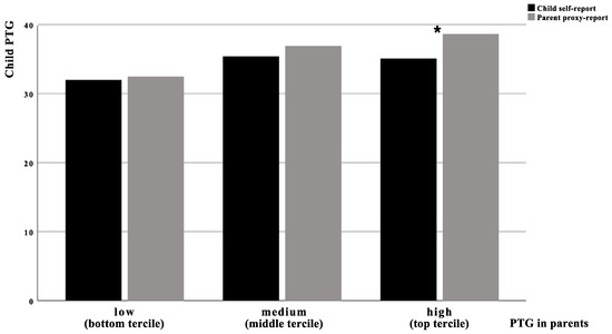 Level of child PTG according to self-reports and the parents’ proxy reports and the level of PTG in parents. * p ≤ 0.05.