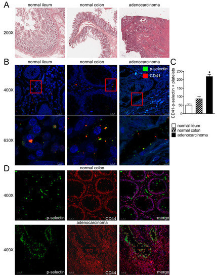Platelets-intestinal cells crosstalk in human intestine. (A) Histology was assessed by H&E staining and was observed by light microscopy (magnification, 200×) in normal ileum, colon and colon adenocarcinoma. Representative specimens are shown. (B) The protein expression of P-selectin and CD41 was investigated by immunofluorescence and confocal microscopy analysis in paraffin-embedded sections from normal portions of ileum and colon and colon adenocarcinoma. P-selectin in green and CD41 in red. Representative images are shown. Magnification 630×. (C) CD-41/P-selectin positive platelets were quantified by ImageJ software. Results are expressed as mean ± SEM (* p < 0.05). (D) The protein expression of P-selectin and CD44 was investigated by immunofluorescence and confocal microscopy analysis in paraffin-embedded sections from normal portions of colon and colon adenocarcinoma. P-selectin in green and CD44 in red. Representative images are shown. Magnification 400×.