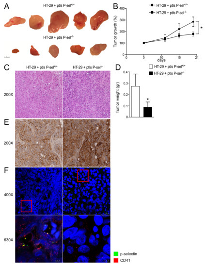 A colorectal cell suspension (100 µL; 1 × 107 HT29 cells from American Type Culture Collection, Manassas, VA, USA) was injected subcutaneously into the subscapular region of an athymic CD1 mice (The Jackson Laboratory, Bar Harbor, ME, USA) as previously described [44]. The animals were treated with platelets isolated from P-selectin−/− or wild- type mice directly injected into the tumor. For xenograft treated with mouse platelets, mice were divided randomly into 2 groups, each group containing 10 mice (i.e., 20 tumors) as follows: P-selectin−/− platelets group and P-selectin+/+ platelets group (control group). Subsequently, 100 µL of platelets suspension (106 platelets) was injected with a 27-gauge needle directly into the tumor-bearing mice in each group every 7 days for a total of 3 injections per mouse. Tumor growth was measured as follows: long diameter (a) and short diameter (b) were measured using a digital vernier caliper, and volumes (V) of the tumors were calculated according to the formula V = ½·a·b2, and a tumor growth curve was drawn. Tumor weight (gr) was measured using a calibrated analytical balance. All the mice then were sacrificed and tumors were harvested for further analysis.