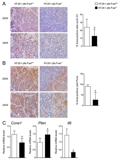 Treatment with P-selectin KO platelets reduced cell cycle progression in xenograft tumor model. Paraffin-embedded tumor specimens from HT-29 cells treated with P-sel+/+ platelets and HT-29 cells treated with P-sel−/− platelets were immunoassayed with (A) cyclin D1 antibody (200× and 300× magnification) and (B) anti-Pcna antibody (200× and 300× magnification). Representative specimens are shown. Cyclin D1 and Pcna staining per field was quantified by ImageJ software and reported as percentage per field. Comparison of HT-29 cells treated with P-sel+/+ platelets and HT-29 cells treated with P-sel−/− platelets (n = 8/group) was performed using the Student’s t-test. Results are expressed as mean ± SEM (* p < 0.05). (C) Gene expression analysis of Ccne1, Pten and Il6 in HT-29 cells treated with P-sel+/+ platelets and HT-29 cells treated with P-sel−/− platelets (n= 20 tumors per group). Cyclophilin was used as a housekeeping gene to normalize data. The results are expressed as mean ± SEM. Statistical significance (* p < 0.05) was assessed by the Student’s t-test.