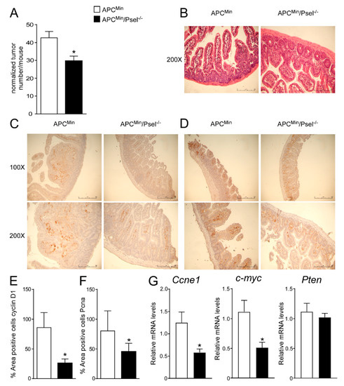 To address the tumor-promoting role of P-selectin in colon cancer, we used a genetic model of intestinal tumor formation. We crossed APCMin/+ with P-sel−/− or control mice to obtain a new genetic mouse model in which the lack of P-selectin occurred in mice that spontaneously developed tumors. The APCMin/P-sel−/− mice exhibited a significant decrease in tumor number compared to the APCMin/+ mice (Figure 4A). The histological examination (H&E) of the APCMin/P-sel−/− mice intestine displayed a more preserved parenchyma than the APCMin/+ mice, whereas a disrupted intestinal structure was detected in the APCMin/+ mice (Figure 4B). Furthermore, in the APCMin/P-sel−/− mice we observed a significant reduction in cyclinD1 and Pcna protein levels compared to the APCMin/+ mice (Figure 4C–F). In the APCMin/P-sel−/− mice, we did not find a significant difference in Pten and Il6 gene expression levels and we detected a reduction in c-myc and Ccne1 gene expression levels compared to the APCMin/+ mice (Supplementary Figure S3, Figure 4G), highlighting that the absence of P-selectin reduces tumor growth after pro-carcinogenic events. All together, these data point to the importance of platelets in tumor induction and progression in genetic, non-inflammatory models.