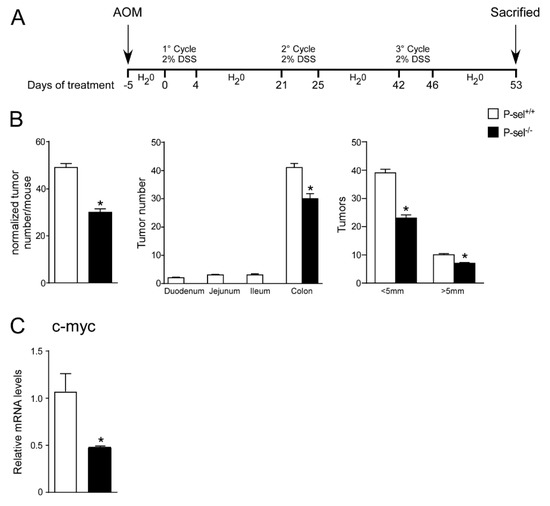 P-selectin KO mice are protected from chronic colitis-associated colorectal carcinogenesis. (A) P-sel-/- (n = 10) and P-sel+/+ (wild-type; n = 10) mice were treated for a colitis-associated colorectal carcinogenesis model through one intraperitoneal azoxymethane (AOM) injection and 3 cycles of 2% dextran sulfate sodium (DSS) in drinking water. (B) Total number of tumors was counted. The diameter of each tumor was measured. The number of tumors with a diameter <5 mm and >5 mm was significantly reduced in P-sel-/- mice showing that these mice are protected from colon cancer formation. Results are the average ± standard error of the mean (SEM); * p ≤ 0.05 (C) Gene expression analysis of c-myc in P-sel-/- and P-sel+/+ mice. Cyclophilin was used as a housekeeping gene to normalize data. The results are expressed as mean ± SEM, * p ≤ 0.05.