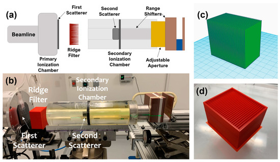 (a) Schematic and (b) photo of the beam line design with ridge filter and range shifters to deliver a spread-out Bragg peak (SOBP) in the mouse. (c) Model of ridge filter and (d) photo of the printed ridge filter with protective casing.