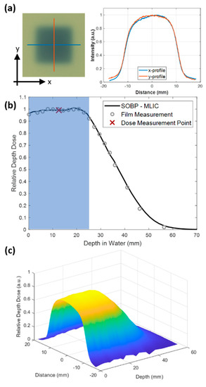 A square collimated field size of 2 × 2 cm2 was achieved at both the entrance and the SOBP using the double-scattering system (Figure 2a). The resulting SOBP had a modulation (width) of 2.5 cm to the distal 90% of the maximum dose (Figure 2b). The measured SOBP from the multi-layer ionization chamber agreed with the measured SOBP from the stacked radiochromic film after normalization (Figure 2b). Mice were irradiated uniformly across the whole abdomen using the entrance of the high-energy proton beam or with the SOBP. Stacked film profiles were acquired and used to verify field size across the modulation of the SOBP, as seen in Figure 2c. Range-shifting material placed in the beam line allowed for the SOBP to be delivered to the whole mouse abdomen while using the high-energy proton beam.