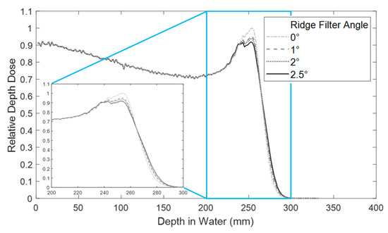 Relative depth dose measurement with a ridge filter in the beam line at various angles. The inset plot shows a zoom of the SOBP region. All studies were performed with the ridge filter at 2.5° for a flat SOBP.