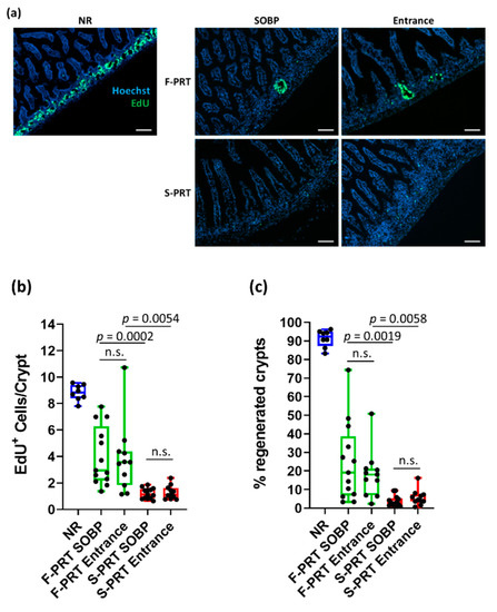 Analysis of EdU incorporation showed that FLASH proton radiotherapy (F-PRT) SOBP normal tissue-irradiated mice showed a significantly higher number of EdU+ cells per crypt and a higher percentage of regenerated crypts than S-PRT SOBP, although both were significantly decreased compared with the non-irradiated tissues (NR) (Figure 4a–c). Interestingly, no significant difference in EdU+ cells and regenerated crypts was observed between SOBP and shoot-through method in both treatment modalities (Figure 4a–c).