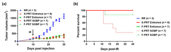 To further evaluate the effect of SOBP and shoot-through methods in both of the proton RT treatment modalities on tumor growth, we used a mouse pancreatic flank tumor model [7]. All RT treatment modalities presented very similar tumor growth inhibition post focal irradiation of 18 Gy (Figure 5a). There was a trend (albeit not a significant difference) towards increased tumor control with the SOBP (both standard and FLASH), which we attribute to the increased relative biological effect (RBE), which is recognized as being 1.0 in the entrance region and 1.1 in the SOBP relative to high-energy photons [14]. Moreover, survival analysis on tumor-bearing mice revealed that although all the S-PRT and F-PRT entrance-treated mice survived the treatment, approximately 70% of the S-PRT SOBP-treated mice succumbed to radiation lethality within the first 20 days post-RT. Interestingly, only 15% of the F-PRT SOBP mice died post-irradiation (Figure 5b) (p = 0.0371 vs. S-PRT SOBP).
