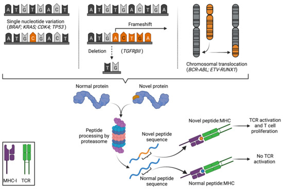 Tumours acquire mutations and genetic alterations that can give rise to non-synonymous changes in amino acid sequence, creating peptides that deviate from “self”. These can occur: at the level of single nucleotide substitutions/variations (SNV) that are not corrected by proofreading and repair processes [15]; through insertion or deletion events that induce reading frameshift changes [16,17]; through intron retention or atypical exon-exon splicing events creating novel sequence at junction points [18,19,20]; through aberrant transcription and translation of non-coding regions of DNA [21]; or at the level of large scale chromosomal changes or gene fusions events—one prominent example being the formation of the BCR-ABL oncogene in CML and ALL (Figure 1) [22,23]. Several decades of accumulated evidence now suggests that the altered peptide products of these genetic changes, designated “neoantigens”, are among the primary means by which the immune system interacts with a tumour, and that altered peptide repertoires are a vital mediator of both naturally occurring and therapeutic immune-mediated tumour control. This review outlines: the identification and validation of mutated peptide neoantigens as a target of the adaptive immune system in preclinical tumour models and in both retrospective and prospective analyses of patient tumours and tumour-specific T cells; the advances in DNA sequencing and bioinformatic processing technologies that have facilitated rapid and reliable analysis of patient tumour mutational profiles and peptide neoantigen prediction; and the therapeutic modalities by which peptide neoantigens have been, and can be targeted in cancer immunotherapy.