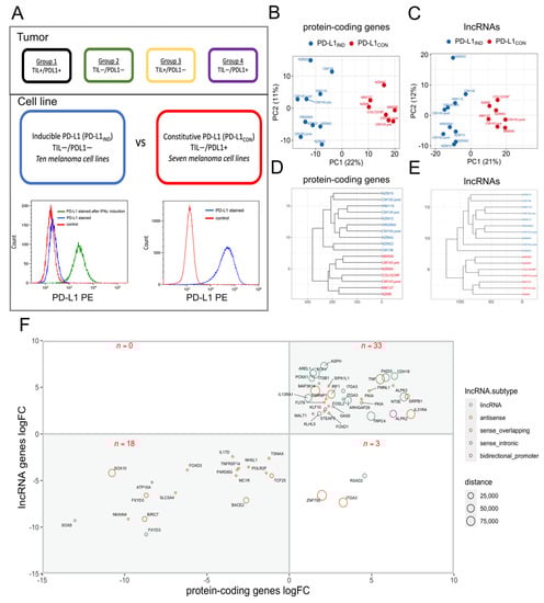 The PD-L1CON group harbours distinct global mRNA and long non-coding RNA expression profiles compared to the PD-L1IND group. (A) A schematic diagram showing the four subgroups of melanoma tumours based on the levels of tumour infiltrative lymphocytes and PD-L1 protein expression []. We used melanoma cell lines and compared transcriptomes between cell lines corresponding to the low PD-L1 (group 2: TIL-/PDL1- or PD-L1IND) and high PD-L1 expression groups (group 4: TIL-/PDL1+ or PD-L1CON). Representative flow cytometry figure of the PD-L1 expression levels in each of the cell lines, representing the two groups are shown below. The flow cytometry figure shows isotype control (red), PD-L1 stained (blue), and PD-L1 stained following 24-hour IFNγ induction (green). The x-axis represents PD-L1 expression levels (log2) and y-axis represents cell counts. (B,C) Principal component analysis (PCA). Shows PC1 (x-axis) and PC2 (y-axis) for the PD-L1IND samples and the PD-L1CON samples using the top 500 protein-coding genes (B) or lncRNAs (C) with the highest variance. (D,E) Unsupervised hierarchical clustering of PD-L1CON and PD-L1IND melanoma cell lines using either expression of all protein-coding genes, or of lncRNAs. (F) The significantly differentially expressed mRNA–lncRNA gene pairs that are located within 100 kilobases to one another are shown. The x-axis and the y-axis show the protein-coding gene and lncRNA expression fold change (log2), respectively. Only the protein-coding gene names are shown. The distance between the mRNA–lncRNA gene pair is represented by the size of the circle, and the lncRNA subtype is shown by the colours.