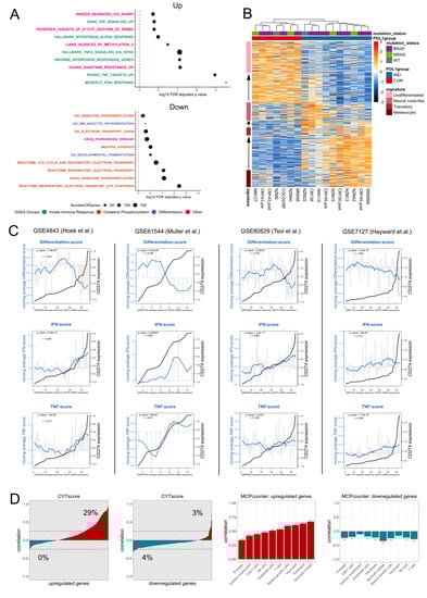 PD-L1CON samples have a reprogrammed transcriptome inclusive of dedifferentiation, reduced oxidative phosphorylation, and an enhanced IFN signalling pathway. (A) The top 20 gene sets that were found to be differentially enriched using the CAMERA test are shown []. The 5 × 10−5 FDR adjusted p value significance threshold is shown by the dotted red line. Gene sets are categorised into those involved in the innate immune response (or cytokine signalling), melanocyte differentiation, oxidative phosphorylation, and others. (B) Heatmap showing the unsupervised clustering of the PD-L1CON and PD-L1IND melanoma cell lines according to the differentiation signature genes from Tsoi and colleagues []. Mutation status according to BRAF (V600), NRAS (Q61 and G13), and double wild-type is shown. (C) Correlation of CD274 expression with the IFN score, TNF score and differentiation score in the four external melanoma cell line datasets. The samples (x-axis) are ranked according to CD274 expression (log2 transformed and corresponds to the right-side y-axis) and the CD274 expression level is shown by the black line. Grey vertical bars indicate the respective scores and corresponds to the left side y-axis. The moving average is represented by the blue line. The Pearson correlation between the moving average and CD274 expression is shown. (D, first and second figure) The y-axis represents the correlation value (Pearson) of the CYT score with either the upregulated (D, first figure) or downregulated protein-coding genes (D, second figure) in the PD-L1CON samples. The x-axis represents all the up (462 genes) and downregulated (298 genes) protein-coding genes. The x-axis is ranked according to lowest to highest correlation value (Pearson). (D, third and fourth figure) The y-axis represents the correlation value (Pearson) of the up (D, third figure) and down PD-L1CON scores (D, fourth figure) (calculated with ssGSEA using the differentially expressed protein-coding genes) with the estimated absolute abundance of various immune subtypes (as measured using the MCPcounter bioinformatic tool).