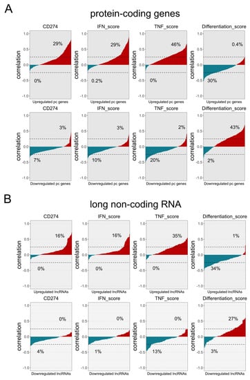 Protein-coding and lncRNA expression signatures of PD-L1CON samples are associated with an increased IFN score and reduced differentiation and oxidative phosphorylation scores in the TCGA SKCM database. (A) The x-axis shows the upregulated (n = 462) (A, top row) and downregulated (n = 298) (A, bottom row) protein-coding genes (A) in the PD-L1CON samples. The y-axis shows the correlation (Pearson) of the protein-coding genes with CD274 expression, IFN score, differentiation score and oxidative phosphorylation score. The x-axis is ranked according the lowest to highest correlation. The percentage of genes higher than 0.25 or lower than −0.25 Pearson correlation value is shown. (B) The x-axis shows the upregulated (n = 106) and downregulated (n = 71) lncRNAs in the PD-L1CON samples. The y-axis shows the correlation (Pearson) of the lncRNAs with CD274 expression, IFN score, differentiation score and oxidative phosphorylation score. The x-axis is ranked according the lowest to highest correlation. The percentage of genes higher than 0.25 or lower than −0.25 Pearson correlation value is shown.