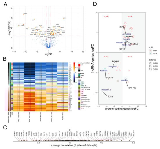 Correlation of lineage-specific and immunity-associated transcription factor mRNAs with PD-L1 expression in melanoma and association with long non-coding RNAs. (A) Volcano plot showing all the differentially expressed TFs in the PD-L1CON group. The 25 and 19 significantly upregulated and downregulated TF mRNAs in the PD-L1CON samples are shown, respectively. The x-axis represents log2 fold change and the y-axis represents −log10 FDR adjusted p value. The red dashed line represent the FDR adjusted 0.05 p value (y-axis) and the 1 log2 fold change (x-axis). (B) Heatmap showing the correlation value (Pearsons) of the 25 up and 19 down regulated TFs with CD274 expression. Rows represent the TFs and are ordered according to the lowest to highest mean correlation with CD274 expression across the four melanoma cell line datasets and the TCGA SKCM RNA-seq dataset. (C) Correlation was calculated between CD274 expression and all TF (n = 1107) across the five gene expression datasets and the TF were ordered from highest to lowest mean average correlation across the five datasets. The direction of the 25 upregulated and 19 downregulated TFs are shown by the direction sidebar. (D) The significantly differentially expressed TFs to lncRNA pairs that are located within 100 kilobases to each other are shown. The x-axis and the y-axis show the TF mRNA and lncRNA expression fold-change (log2), respectively. The distance between the TF mRNA and lncRNA gene are shown by the size of the circle.