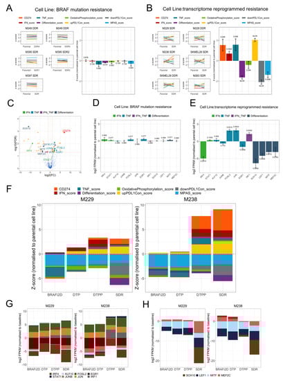 PD-L1CON expression is associated with treatment resistance to MAPK inhibitors when associated with transcriptome reprogramming. (A,B) Five melanoma cell lines that acquired BRAF mutations (splicing and copy number amplification) upon development of resistance and six melanoma cell lines that did not acquire mutations but exhibited a transcriptome reprogrammed state upon development of resistance are shown. CD274 expression and seven scores which includes the IFN score, TNF score, differentiation score, oxidative phosphorylation score, the MPAS score, and the up and down PD-L1CON scores are shown for the parental (before treatment) and after BRAFi resistance (SDR = single drug resistance, DDR = double drug resistance). The bar plots show values normalised to the corresponding baseline sample. Bar plot values are averages across all samples within either the BRAF mutation resistance group or the transcriptome reprogrammed resistance group. FDR adjusted p values for paired t test are shown for each bar. Error bars represent standard error. (C) Volcano plot shows the TFs that were differentially expressed in the PD-L1CON samples and in addition, involved in IFN signalling, TNF signalling, both IFN and TNF signalling (labelled as “IFN_TNF”), and the melanocyte differentiation pathway. The CD274 gene is shown in red. (D,E) Bar plots shows the expression changes of TFs (involved in the IFN, TNF signalling, and melanocyte differentiation) following acquired resistance with either BRAF mutations or transcriptome reprogramming in melanoma cell lines. Error bars represents standard error. (F) Cumulative barplot shows the CD274 expression and the seven scores at different stages of BRAFi resistance for the M229 and M238 melanoma cell lines. Values are normalised to the parental cell line, and resistance stages include (1) two days of BRAFi treatment (BRAFi2D), (2) Drug Tolerant Persisters (DTP) where a small subpopulation of persisting cells remain, (3) Drug Tolerant Proliferative Persisters (DTPP) where proliferation was regained, and (4) single drug resistance (SDR), a permanent resistant state to BRAFi. (G,H) Cumulative barplot shows the mRNA expression changes of TFs involved in the IFN signalling, TNF signalling, and melanocyte differentiation at different stages of BRAFi resistance for the M229 and M238 melanoma cell lines.