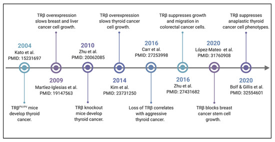 Timeline of seminal studies of TRβ tumor suppression. TRβ function was first linked to cancer growth when it was shown that an expression of ligand-binding domain mutant (TRBPV) in mice led to spontaneous development of thyroid tumors. Increasing numbers of studies have demonstrated over the following two decades that TRβ is a classically-defined tumor suppressor.