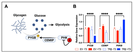 TRβ may regulate glycogen metabolism (A) in anaplastic thyroid cancer cells. RNA-sequencing [17] revealed a novel function of liganded TRβ on metabolism in a cancer cell model (B). TRβ and T3 induced significant changes in gene expression in the glycogen pathway to decrease levels of PYGB and the glycogen signaling protein CEMIP. TRβ also enhanced the inhibitory beta subunit of PHK which phosphorylates and activates PYGB to enhance glycogen breakdown and potentially cell survival. Significance was determined using two-way ANOVA followed by Dunnett’s multiple comparisons test (**** p < 0.001).