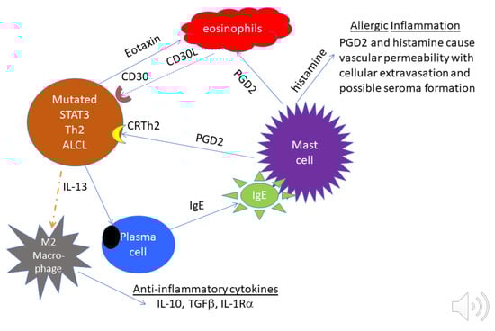 Proposed relationship between tumor cells and microenvironment in BIA-ALCL. On the left, tumor cells with mutated STAT3 release Eotaxin which attracts eosinophils. Eosinophils are known to express the CD30 ligand, which can support the proliferation of CD30+ tumor cells. At the lower left, tumor cells release IL-13 that polarizes macrophages to produce anti-inflammatory cytokines and induces plasma cells to produce IgE. In the center and upper right, IgE activates mast cells to release PGD2 to attract Th2 cells and eosinophils. PGD2 and histamine from activated mast cells cause vascular permeability, which may contribute to seroma formation.