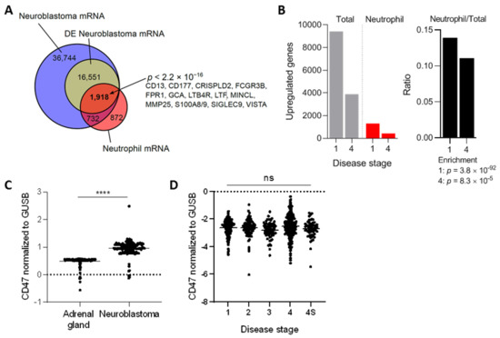 (A) Venn diagram showing overlap between neuroblastoma (Zhang et al. [39]) and neutrophil (Grassi et al. [40]) regulated transcripts. Overrepresentation was determined with a Fisher exact test. DE, differentially expressed. (B) Proportion of neutrophil associated genes in neuroblastoma stratified according to disease stages 1 and 4 (left panel: absolute numbers, right panel: ratios). Enrichment determined with Fisher exact tests. (C) Normalized CD47 mRNA expression levels in healthy adrenal gland and neuroblastoma tumors. Adrenal gland: n = 127, neuroblastoma: n = 162. Statistical significance was tested with unpaired t-test; **** p < 0.0001. (D) Normalized CD47 mRNA expression levels in neuroblastoma patients stratified by disease stage. Stage 1: n = 121, stage 2: n = 78, stage 3: n = 63, stage 4: n = 183, stage 4S: n = 53. Statistics were performed by one-way ANOVA; ns, not significant.