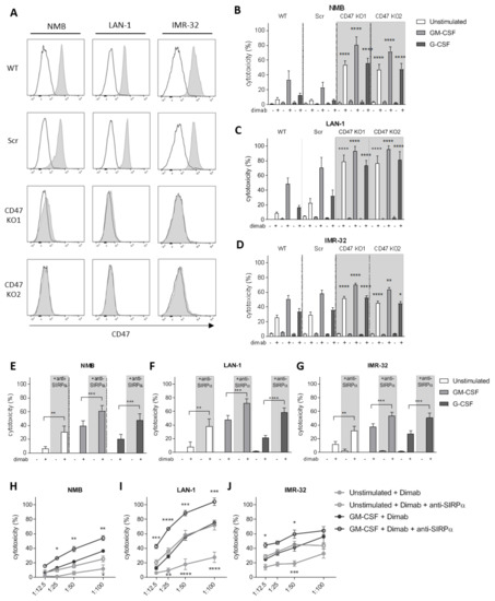 (A) Representative histograms depicting CD47 surface expression (n = 3) as analyzed by flow cytometry on (from left to right) NMB, LAN-1, and IMR-32 control cells (top two rows) and their respective CD47 KO variants (bottom two rows). Secondary antibody controls are represented in white. (B–D) ADCC of control (WT and Scr, no background) and CD47 KO (CD47 KO1 and CD47 KO2, grey background) NMB (B), LAN-1 (C), and IMR-32 (D) cells opsonized with (+) or without (−) dinutuximab (dimab) by unstimulated neutrophils (white bars) or stimulated with GM-CSF (light grey bars) or G-CSF (dark grey bars). n = 6, of 3 individual experiments. Statistics were performed by one-way ANOVA with Sidak correction for multiple comparisons. (E–G) ADCC of NMB (E), LAN-1 (F), and IMR-32 (G) cells opsonized with (+) or without (−) dinutuximab (dimab) by unstimulated neutrophils (white bars) or stimulated with GM-CSF (light grey bars) or G-CSF (dark grey bars) in the absence (no background) or presence (grey background) of SIRPα blocking agent. n = 6–14, of 7 independent experiments. Statistical analysis was assessed with by a paired t-test. (H–J) ADCC of dinutuximab-opsonized NMB (H), LAN-1 (I), and IMR-32 (J) cells by unstimulated neutrophils (light grey circles) or stimulated with GM-CSF (dark grey circles) in the absence (filled circles) or presence (empty circles) of SIRPα blocking agent at different T:E ratios ranging from 1:12.5 to 1:100. n = 5, of 4 individual experiments. Statistical differences were tested with two-way ANOVA with Tukey’s post hoc test; * p < 0.05; ** p < 0.01; *** p < 0.001; **** p < 0.0001. ADCC, antibody-dependent cellular cytotoxicity. WT, wildtype. Scr, scrambled.
