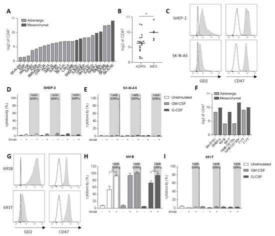 (A) CD47 mRNA expression levels (expressed as log2) on a panel of 24 neuroblastoma cell lines. Depicted in light grey are the cell lines of adrenergic phenotype while dark grey bars represent mesenchymal cell lines. (B) Scatterplot showing the pooled CD47 mRNA expression (expressed as log2) of the panel of 24 neuroblastoma cell lines divided by phenotype: adrenergic (n = 19) and mesenchymal (n = 5). Statistical significance was assessed with unpaired t-test; * p < 0.05. (C) Representative histograms depicting GD2 (left) and CD47 (right) surface expression (n = 3) as analyzed by flow cytometry on SHEP-2 (top) and SK-N-AS (bottom) cells. Isotype and secondary antibody controls are represented in white. (D,E) ADCC of SHEP-2 (D) and SK-N-AS (E) cells opsonized with (+) or without (−) dinutuximab (dimab) by unstimulated neutrophils (white bars) or stimulated with GM-CSF (light grey bars) or G-CSF (dark grey bars). n = 6, of 3 individual experiments. Statistical significance was tested with a paired t-test. (F) CD47 mRNA expression (expressed as log2) on a panel of four isogenic neuroblastoma cell line pairs with opposite phenotype: adrenergic (light grey) and mesenchymal (dark grey). (G) Representative histograms showing GD2 (left) and CD47 (right) surface expression (n = 2) as analyzed by flow cytometry on 691B (top) and 691T (bottom) cells. Isotype and secondary antibody controls are represented in white. (H,I) ADCC of primary patient-derived 691B (H) and 691T (I) cells opsonized with (+) or without (−) dinutuximab (dimab) by unstimulated neutrophils (white bars) or stimulated with GM-CSF (light grey bars) or G-CSF (dark grey bars) n = 4–6, of 3 individual experiments. Statistical significance was tested with a paired t-test; ** p < 0.01. ADRN, adrenergic. MES, mesenchymal.