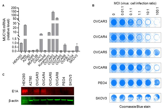 3.3. Replication and Oncolysis of Ad5/MUC16-1040 in Ovarian Cancer Cell Lines Is Dependent on CA-125 Expression