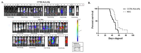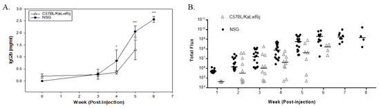 For serum Ig analysis, the plasma were isolated from collected sera each week and stored at −20 °C as described in the Material and Method section. Serum IgG2b was measured by ELISA kit (Invitrogen Co., Carlsbad, CA, USA) Due to a difference in survival rate, serum collection ended at week 5 in C57BL/KaLwRij mice while continuing until week 6 in NSG mice. As expected, NSG has an undetectable level of IgG2b in control mice, so expressed as 0 mg/mL. As shown in Figure 2A, a significant increase of serum IgG2b level in NSG mice was noticed from 4th week and continuously increased in a ranges of 0.287–2.564 mg/mL. On the contrary, no significant change of IgG2b level in C57BL/KaLwRij mice were shown on weeks 3 and 4 with averages ranging between 0.267 and 0.363 mg/mL from 0.206 mg/mL at week 0. At week 5, serum IgG2b sharply increased to 1.303 mg/mL, suggesting that tumor burden in C57BL/KaLwRij mice become apparent, resulting in death. Apparent differences of serum Ig levels from the baseline appeared in the fourth to fifth week of post-injection in C57BL/KaLwRij mice while appearing in the third to sixth week in NSG mice.