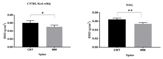 As shown in Figure 3, ex vivo DEXA analysis reveals that MM-induced NSG mice showed a significant reduction of the bone mineral density (BMD) (p = 0.0043) in the spine compared to their control. In contrast, MM-induced C57BL/KaLwRij mice showed a reduction of BMD recorded as (p = 0.0197) compared to control. Although differences of MM vs. control in both models demonstrated significant bone mineral loss, the more minor variation in the NSG model made a further significant difference than the C57BL/KaLwRij model.